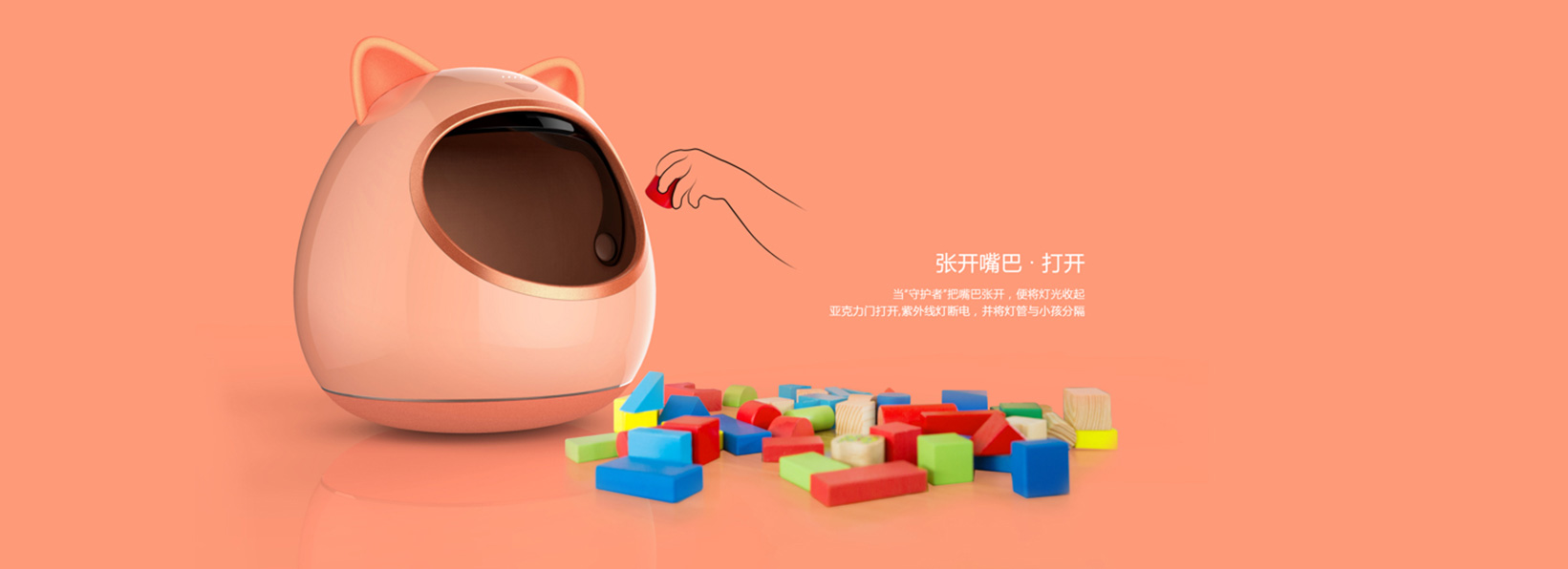 玩具消毒器 打不倒的守护者,永远守护着身边的小伙伴。 此设计灵感来自不倒翁,收拾好的玩具不会被轻易地弄倒洒出。
